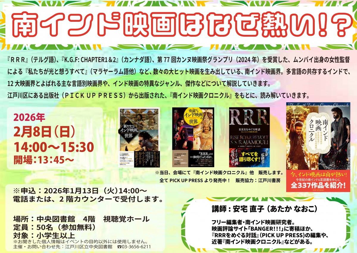 弊社刊行『南インド映画クロニクル』の著者である安宅直子先生の講座がございますので、宜しければ是非お越しください。