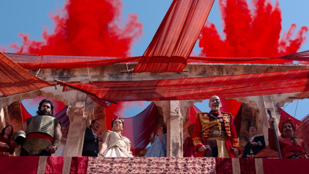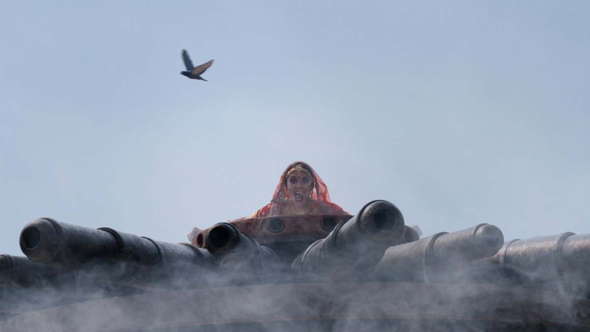 ヴァーリバンがそこから武芸者としての遍歴をスタートさせた因縁の地であるアンバットゥール・マライコッタイでは、西欧人の王が恐怖政治を敷いている。当然ながらこのセグメントはイギリスをはじめとしたヨーロッパ列強によるインド植民地支配のメタファーであり、アクションシーンには、1919年に起きた大虐殺「ジャリヤーンワーラー・バーグ事件」を思わせる構図も出てくる。しかしアンドレア・ラヴェーラ(イタリア人)が演じる王とディアナ・ナソノヴァ(ロシア人)が演じる王妃は、マコーレーというアイルランド風の名前を持ちながら、イタリア語やロシア語、そしてたどたどしいマラヤーラム語を話すという自由さ。周りを固める兵たちは「プレジデンシー・アーミーズ」と称されたイギリス東インド会社の兵士のようであり、特徴的な真っ赤な制服を身にまとい、あたりに漂う赤い色粉と共に禍々しい殺戮の気配を漂わせる。王の周りではやし立てる白人の取り巻きたちは、まるで現代インドのビーチで寝そべるヒッピーのようだ(実際にビーチでリクルートされたエキストラなのかもしれない)。そしてヴァーリバンとの果し合いに臨むマコーレー夫妻の佇まいは、ほぼ格ゲーのそれである。