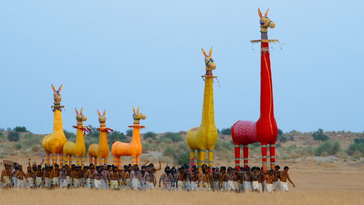 どす黒さを帯びた赤に染められたアンバットゥール・マライコッタイから、クライマックスのティルチェンドールの大平原に移ると、画面は一転して黄色に彩られる。とてつもない量の黄色いターメリック粉が大気中に舞うその情景は、まずマハーラーシュトラ州ジェージュリーのカンドーバー寺院で行われるバンダーラー(ターメリック)祭を思わせる。この奇祭はアーミル・カーン主演のヒンディー語作品『PK ピーケイ』(2014)のソング「Bhagwan Hai Kahan Re Tu〔神よ、どこにおわすのか〕」でも印象的に描かれていた。しかし本作中の「聖なる大馬祭」はそれだけではなく、ありとあらゆる要素が詰め込まれたカーニバルだ。巨大な張りぼての馬の行進はケーララ州中部のヴァダッカンチェーリで行われるマッチャード・マーマーンガム祭などで見られるもの。黄色く煙る熱気の中で踊る人々の中には、タミル地方の芸能であるクディライ(木偶の馬)を付けて踊っている者もいれば、カラガーッタムという舞踊のサブジャンルであるクラヴァン・クラッティ・アーッタムに特有のウルトラ・ミニスカートをはいた女性たちの姿もある。群衆のほとんどが仮面を着けているが、その仮面は必ずしも全てがインドのものではなさそうだ。仮面集団の中をさまようヴァーリバンの姿は、ベルギーの近代画家ジェームズ・アンソール(1860 - 1949)が描きつづけた仮面モチーフの絵画をも思い起こさせる。